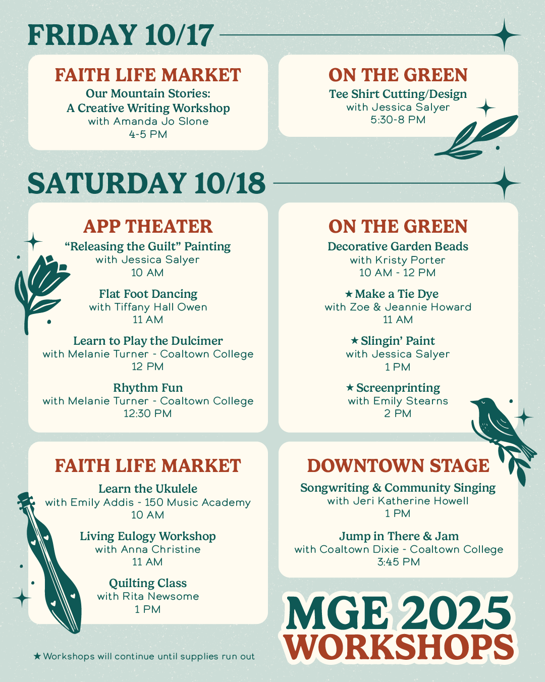 Appalachia is a place of strong voices and unforgettable stories. In this interactive one-hour workshop, participants will be invited to capture their own “mountain story” through short, guided writing exercises. Together, we’ll explore the sounds, places, and moments that shape our sense of home and community. No previous writing experience is needed. Come with a willingness to reflect and explore. Like gathering on the front porch, this workshop offers space for stories to be honored and creativity to flow. Participants will leave with a written piece that celebrates their own unique connection to the mountains.